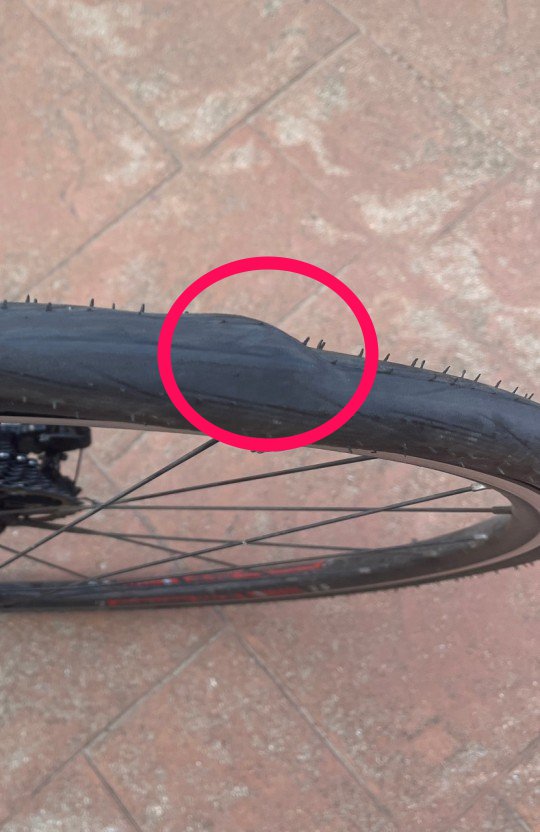 자전거를 세워두고 타이어의 전체적인 모양을 확인해 봤을때, 타이어의 어느 한 부분이 튀어나오면, 타이어 내부의 구조적인 문제가 발생한 것입니다.